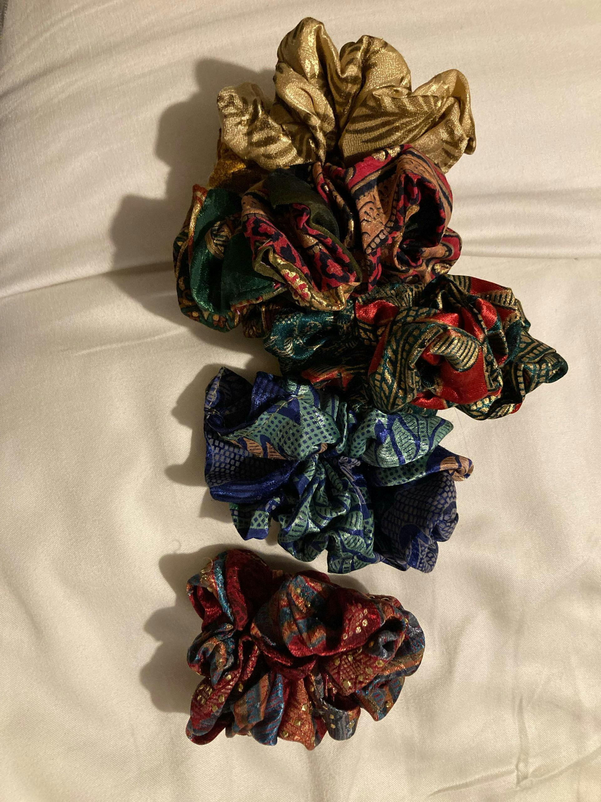 Indulge in a variety of luxury with our handcrafted 5-pack assorted 100% saree silk scrunchies. Each scrunchie is unique, made from recycled saree silk and offering a touch of elegance to your outfit. Perfect for braids, ponytails, or as stylish bracelets.